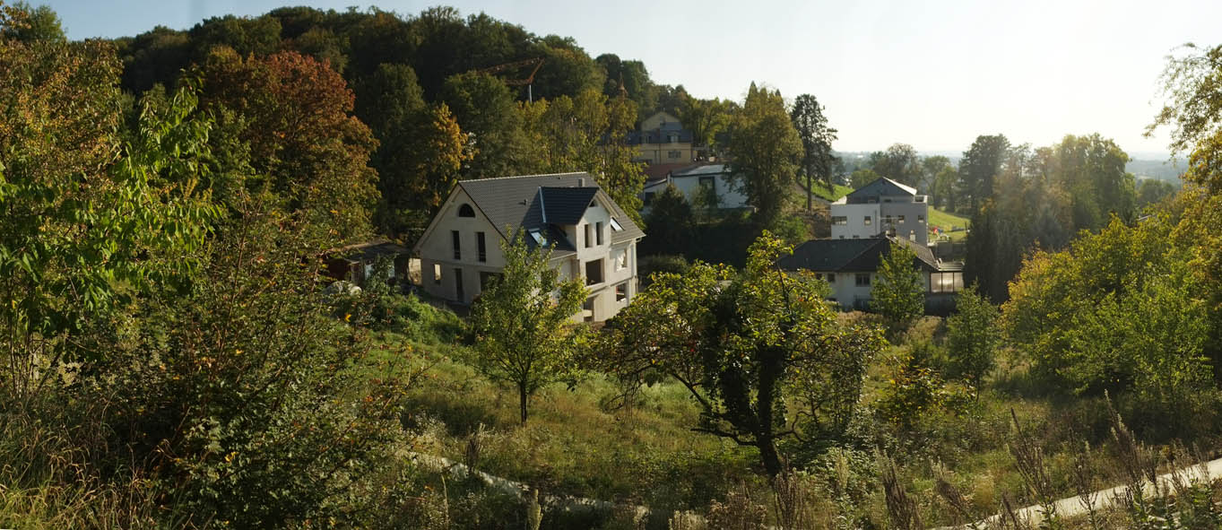Fotos: NABU/Tino Westphal – Baugebiet unter Monitoring am Blütenhang: links im Bild der Rohbau des ersten Einfamilienhauses; zwei weitere werden rechts daneben folgen.