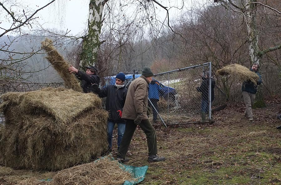 Dazu noch die zwei riesigen Heuballen auf einen Hänger und los geht es von den Etzwiesen wieder nach Malchen auf die Frühjahrsweide.