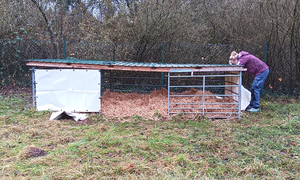 Auch für die NABU-Schafe am Malchener Blütenhang geht es kurz vor der Weihnachtszeit auf die Winterweide. Auch wenn es noch schön grün ist auf der Winterweide – hier stehen schon zwei große Heuballen für die futterarme Zeit bereit. Auch der Stall wird dort aufgebaut und mit reichlich Stroh als Einstreu ausgerüstet.
