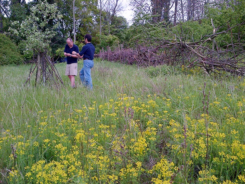 Zelle, Tino, Mahmoud und Martin bereiteten die Schafweide in Malchen für die erste Beweidung mit Heidschnucken vor. Einige Kubikmeter Holz und Abfälle wurden am Wegrand und an der künftigen Einfahrt zur Weide weggeschaufelt, der Naturzaun um einige Meter verlängert, Brennholz gestapelt. Zelke kappte dutzende Götterbaumschößlinge und zu guter Letzt wurden noch die Apfelbäume vor Verbiss geschützt. Wir sind ein gutes Stück vorangekommen.