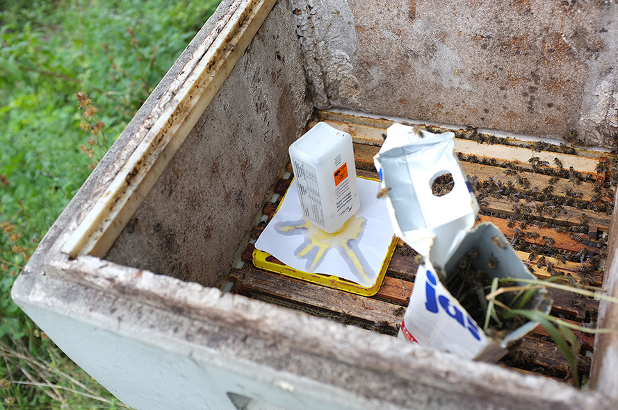 Nach dem Abschleudern des Honigs Ende Juli wird zeitnah eine erste Behandlung mit Ameisensäure durchgeführt und aufgefüttert mit Zuckerwasser.