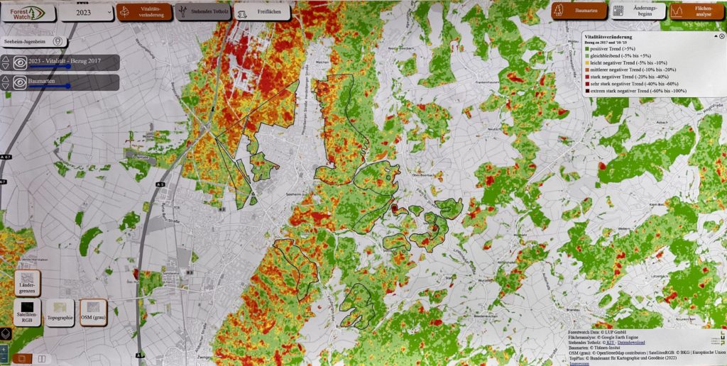 Das Statement wurde durch eine Karte ergänzt, welche die Vitalitätsveränderungen im Seeheim- Jugenheimer Wald zeigt, also Baumschäden, die in den vergangenen 8 Jahren insbesondere durch andauernde Dürreperioden entstanden sind.