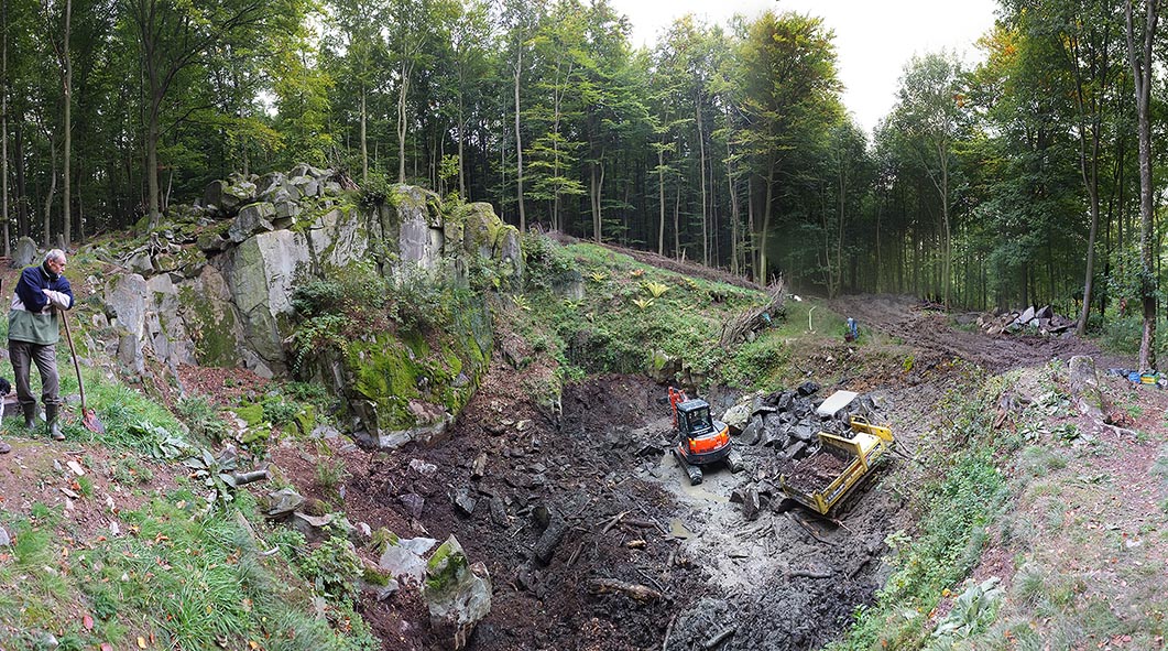 Der Steinbruchbetrieb wurde 1957 eingestellt. Seit dem fielen Laub, Holz, Erde und Steine in den Bruch. In ihm befand sich nur noch lebensfeindlicher Schlamm, der fast keinen Sauerstoff enthielt. Letztes Jahr hat der Forst einige Bäume gefällt, damit mehr Licht und weniger Laub in den Steinbruch fallen. Im vergangenen Winter und im Oktober dieses Jahres haben die Wühlmäuse, der NABU und etliche weitere Helfer den Schlamm herausgebaggert. Jetzt beginnt er sich langsam wieder mit Wasser zu füllen.