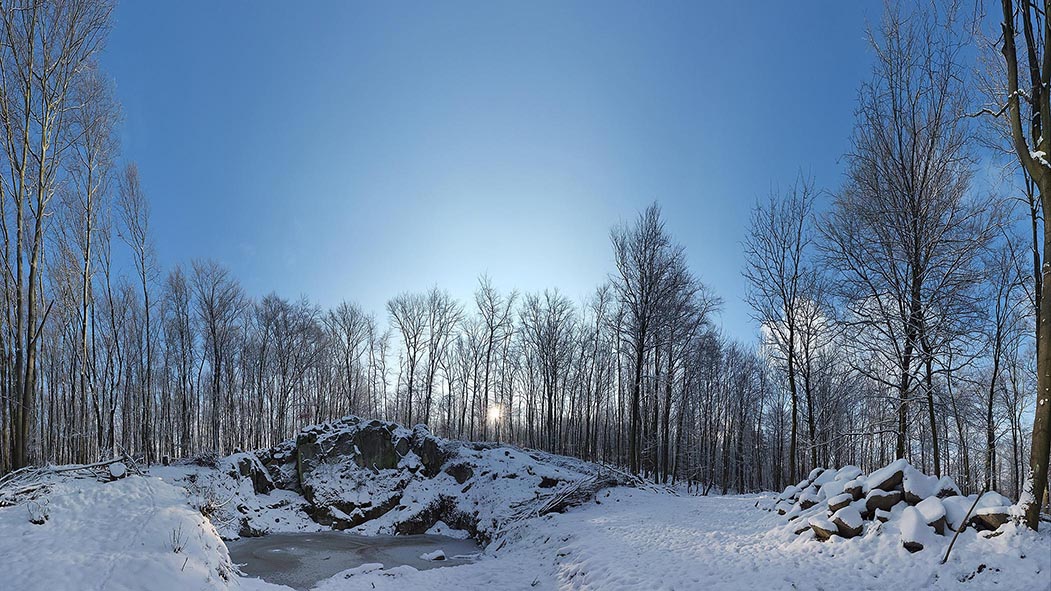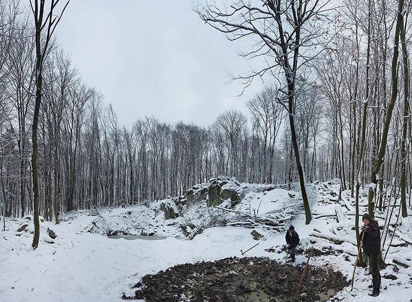 Fotos: NABU/Tino Westphal – Wassersteinbruch über Malchen bei eisigem Wetter. Nach der Ausbaggerung im Oktober ist er bereits gut gefüllt mit Wasser. Wetterbedingt kann der Arbeitseinsatz mit den Wühlmäusen leider nicht stattfinden.