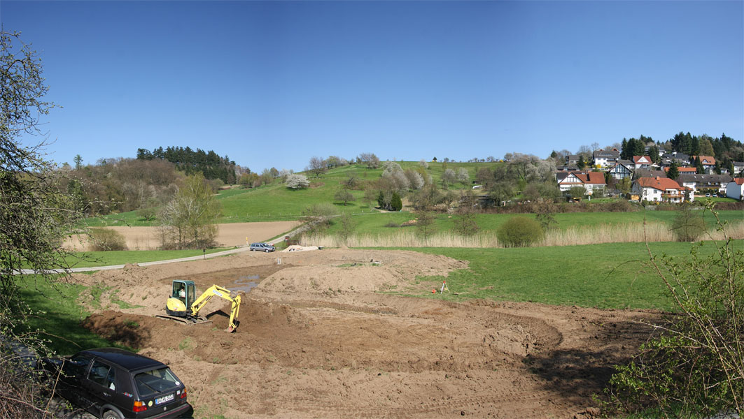 Das Baggerteam hat drei Tage am künftigen Weiher am Beerbach gebaggert- nahezu die gesamte künftige Wasserfläche ist freigelegt, das Ufer befestigt, der Damm fast auf Endhöhe.
