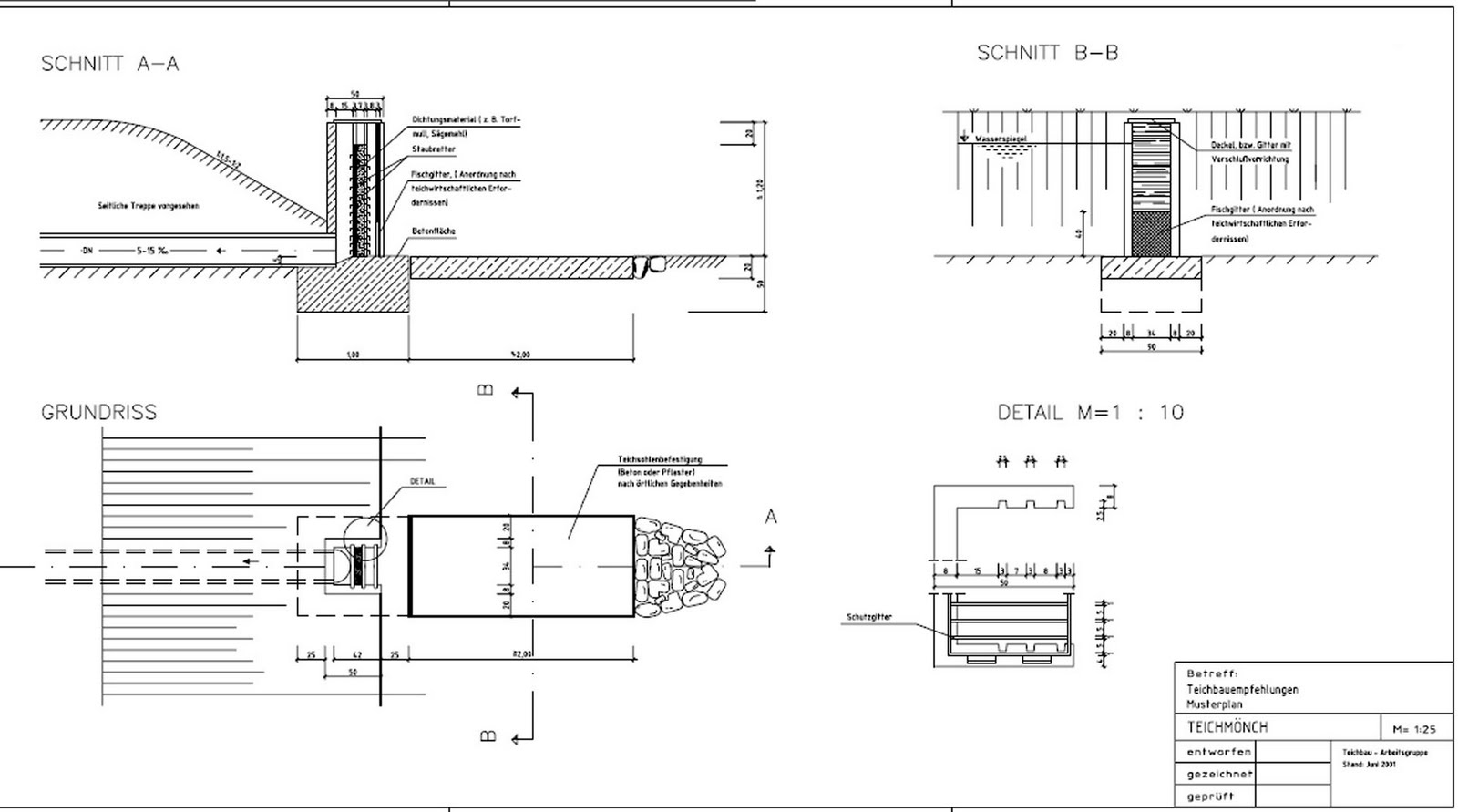 b) Eine Woche darauf wird ein Mönch eingebaut und angeschlossen. Nein, wir betonieren keine Kleriker ein- das ist ein Wasserstandsregler, mit dem Teiche ausgerüstet werden; siehe Skizze rechts.